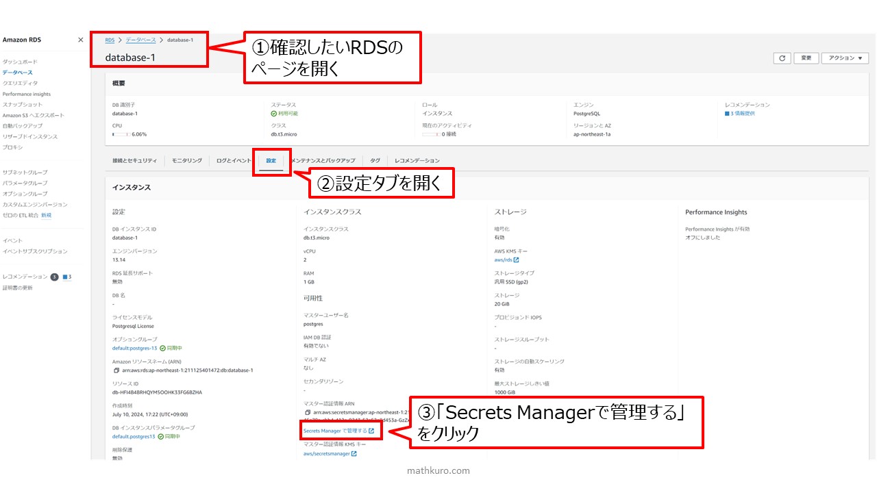 確認方法はいたって簡単で、確認したいRDSのインスタンスのページで、「設定」のタブを開き、「Secrets Manager で管理する」のリンクをクリックするだけです。