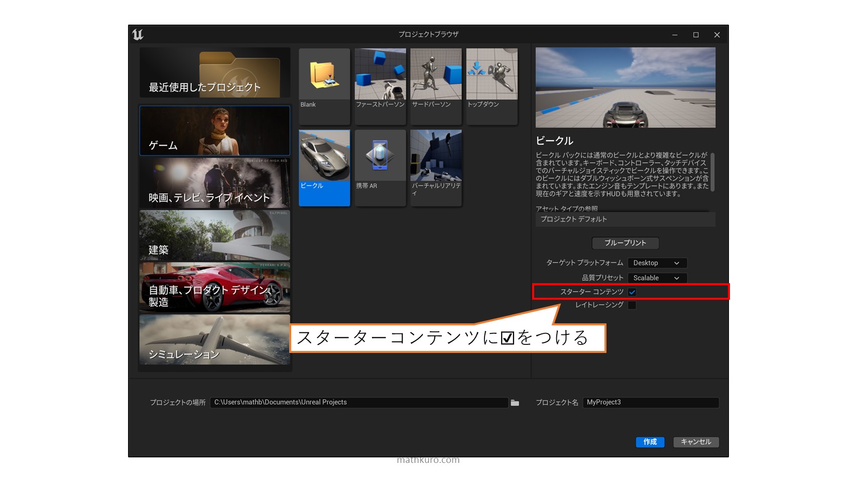といっても、プロジェクト作成時に「スターターコンテンツ」にチェックを入れるだけでOKです。